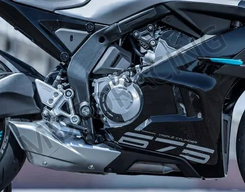 Ο κινητήρας είναι ο πρωταγωνιστής της ιστορίας. Πρόκειται για έναν εντελώς νέο, τρικύλινδρο εν σειρά κινητήρα 675cc, τετράχρονο, υγρόψυκτο, με στρόφαλο crossplane. Η αρχιτεκτονική του κινητήρα είναι εξαιρετικά ευφυής: η CFMOTO διατήρησε τις εσωτερικές διαστάσεις 77x55,2 mm του δικύλινδρου 450SR, πρόσθεσε έναν τρίτο κύλινδρο, και το αποτέλεσμα είναι τα 675 κυβικά. Με ψεκασμό Bosch, αποδίδει 94 ίππους στις 11.000 σ.α.λ. και 70 Nm ροπής στρέψης στις 8.250 σ.α.λ. στην έκδοση Euro 5+.